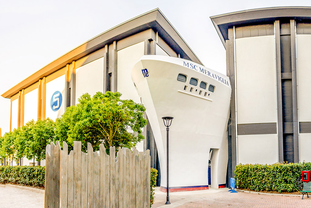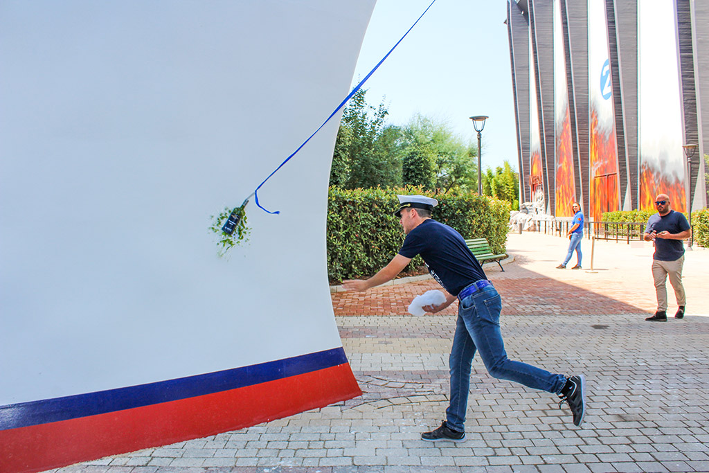 Altissima, imponente e bianca: una nave da crociera è approdata al Parco incagliandosi tra i due teatri dell'area Adveture Land.
